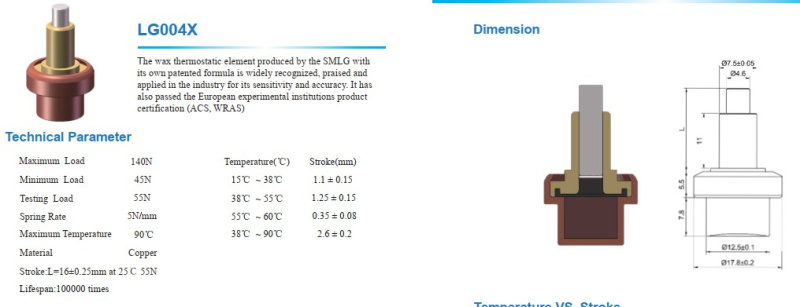 Basic Theory of Operation: Wax is in the lower section, below the seal. Hot Water causes the wax to melt and expand. The wax can only expand upward, against the seal, which moves the piston/pin upward. When wax cools it goes back to solid state and shrinks; lowering seal & piston. (spring force when element is installed in LK550 forces the piston down)