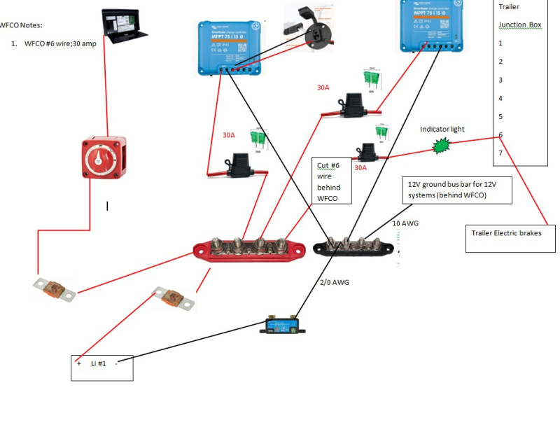 But, an important thing to note is the power for the electrical emergency brakes comes from the outside junction box. So this still needs to be powered. To do this, I connected the downsteam #6 wire (where it was cut behind the WFCO and runs outside) , also to the bus bar. This will then provide power to the trailer junction box (provided the inside switch is on). I added a small indicator light so I can alway see the trailer brakes had power.