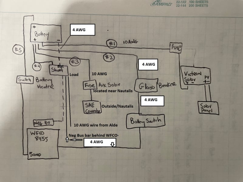 1. The larger (4 AWG?) red wire goes to Gloso breaker and then onto the ON/OFF switch and then to the WFCO