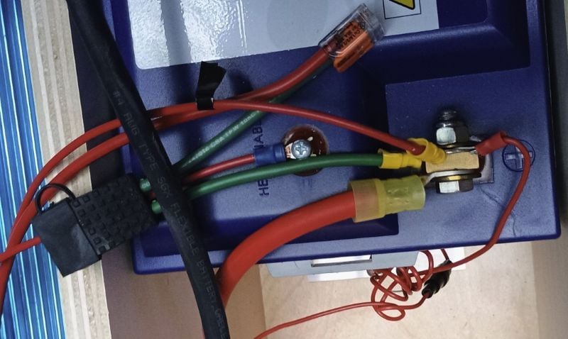 3. The small red wire connected to the +terminal (yellow crimp) in combination with the other red wire connected to the Heater Enable screw (blue crimp) and the black switch located in the bedside cubby, enable the battery internal heater to operate as needed.