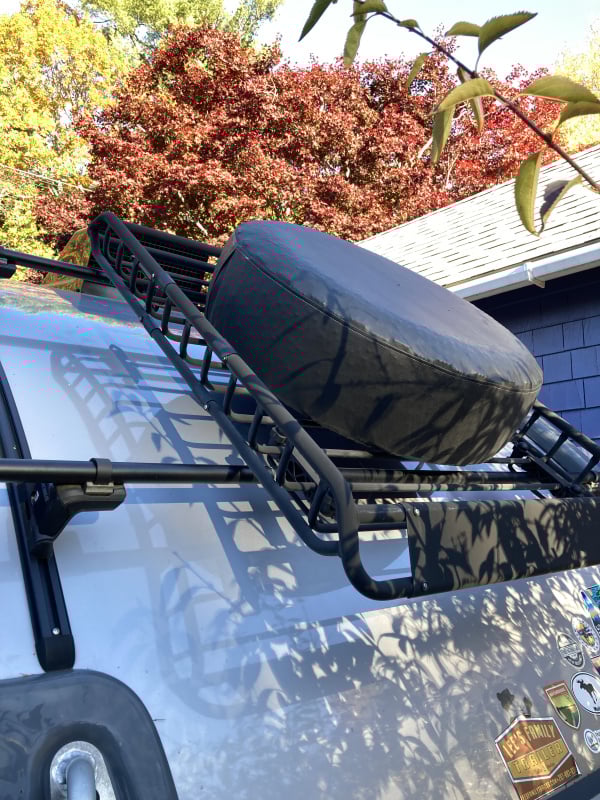 Warrior rack on back with tire mounted (original tongue mount still available)