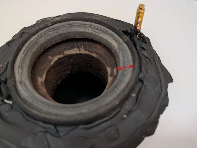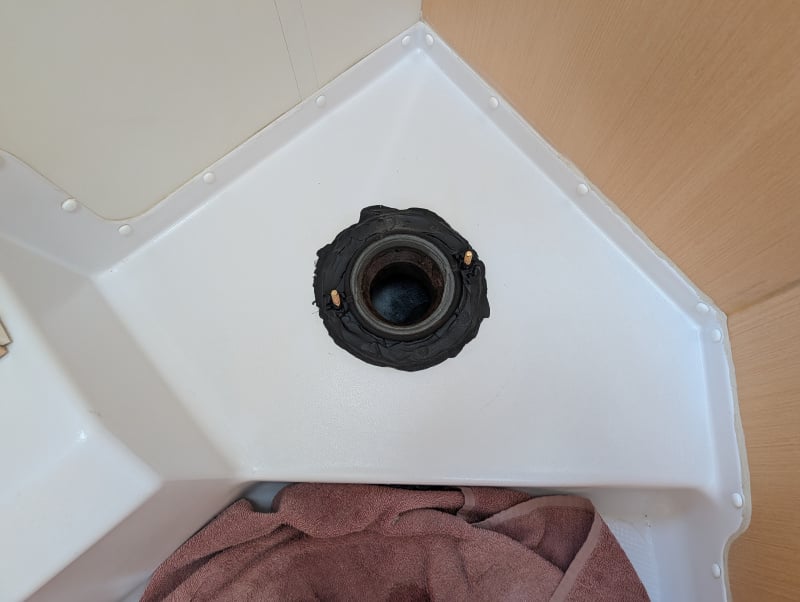 The floor after removal, note the black goop holding the bolts and flange including the flange seal to the floor.