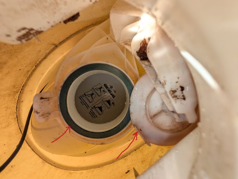 After six years of full-time use the blade seal, Thetford Part Number 31708, on my Aqua-Magic V toilet in my 2019 T@B 400 started to leak preventing water from staying in the toilet bowl between flushes. Removing the toilet was easy, in part because the toilet is so light compared to a residential toilet. Two hold-down nuts spun off easily and the water supply was hand tight. The toilet slipped out of the floor seal, Part Number 33239, aka "closet flange seal," easily though I could tell that accumulation of crud caused a little resistance, but no damage. I planned to replace the floor flange seal but it was glued in place when nuCamp installed the flange and hold-down bolts to the shower floor. The glue surrounded the floor seal and I didn't want to fight that battle. To my pleasant surprise when I scrapped the crud off of both seals they were in pretty good condition, but I replaced the blade seal anyway and cleaned the blade. That wasn't easy while the blade was still in place in the toilet. The way the toilet is constructed the underside cavity gets splashed with waste so I did some extra cleaning. That was difficult because you have to reach through a small opening to access the area, that includes where the blade seal is installed. Hopefully the captions on the photos explain.