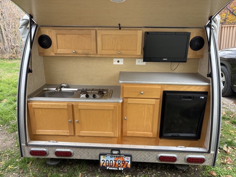 -Clam shell shape with lift-up outdoor kitchen off the back allows for more space inside