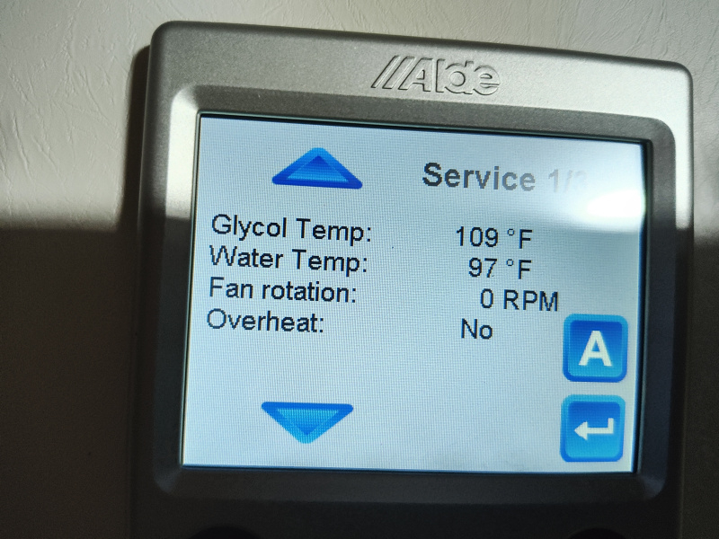 The Service menu is very useful at times, especially when owners are confused about whether or not the Alde is actually working or not.  On that page in your photo, the glycol temp at 109F and the slightly elevated water temp tells us that your Alde is working, probably on "Electric".  If the Alde was running on propane, the Fan Rotation section would tell you the speed of the exhaust fan for the Alde.  (It only runs on the propane heating function).  Whenever you might be a little confused about "Is this thing on!?" just have a look at those temps in the Service menu.