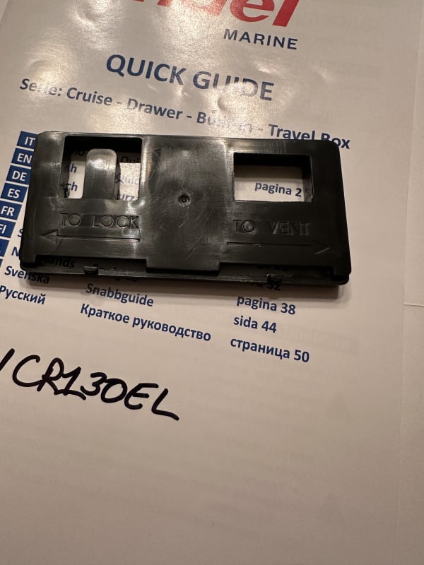 Isotherm fridge model CR130EL in new NuCamp Haven. The door would not latch securely and at the top of the door frame, there is a piece that shows two areas where I suppose the latch engages: one says “TO LOCK” and the other says “TO VENT”. This piece would slide back and forth, and when I was checking it out it came loose and fell into my hand. Anyone had similar issues?