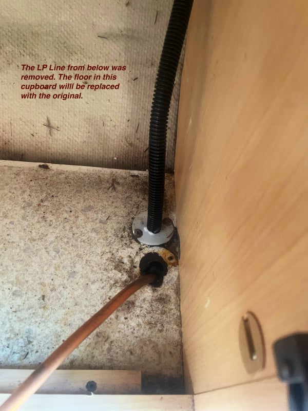 I started installation by removing the LP line that went to the NorCold and will cap the line from below with a FSAE Flare cap. I calculated the approximate position for the new unit and built a temporary platform to test the fit. A little tweaking will be done and a new drawer or cupboard will be made below the fridge and a new cupboard will be made to the side between the entry and the fridge. Both additions will increase storage in the galley.