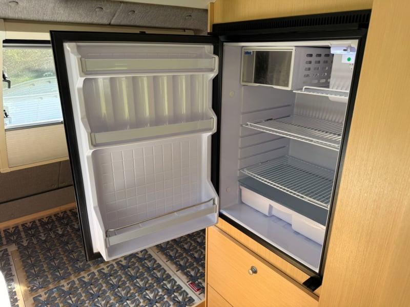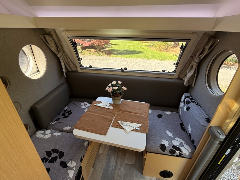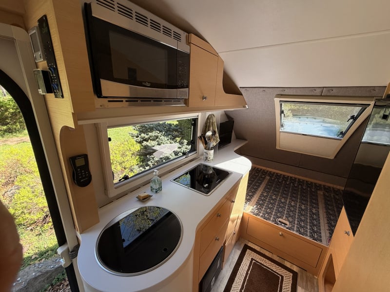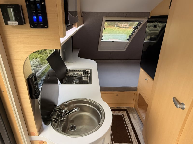 - Kitchen: 2-burner stove, sink, 12V Isotherm compressor fridge