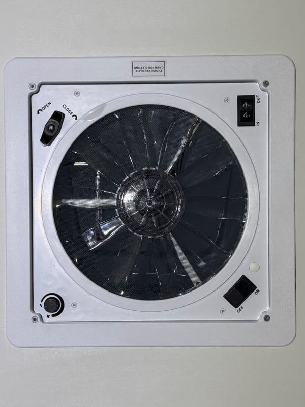 We run fan outgoing at low speed 100% of time when occupying camper. Reverse to inflow during showers and heating water on stove.