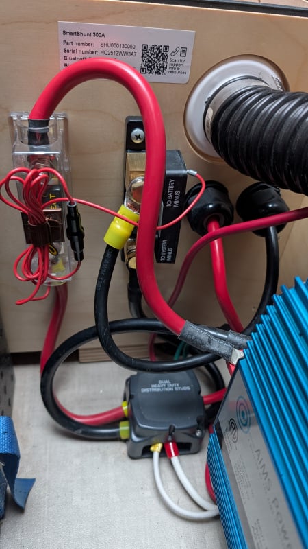 Today I will mount a Victron 100/20 controller in the space under the port side seat, connecting existing wiring to solar panel and battery. I’m working out how to wire up the Victron SmartShunt that will arrive in a few days. Through meter testing, it looks like the wires that come from the solar controller go straight to the battery. So my plan is to wire the shunt into the negative side battery wire coming from the controller, and then mount the shunt beside the solar controller. Does anyone see any issue with that plan? Seems like it would be a clean install with no weather issues.