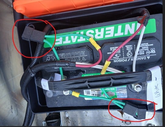 On your battery wiring, there are two sets of cables.  One set is for the battery power to the trailer, and the other set goes to the solar port on the side of the tub.  Both the positive cables are equipped with 30 amp fuses.