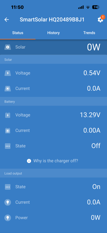 The next thing we should look at is the setup of your Victron solar controller.  If you are not very familiar with the workings and readouts of the Victron devices, we should have a look at them with you and make sure your solar setup is correctly set up for charging a lithium battery.  Show us the setup page.