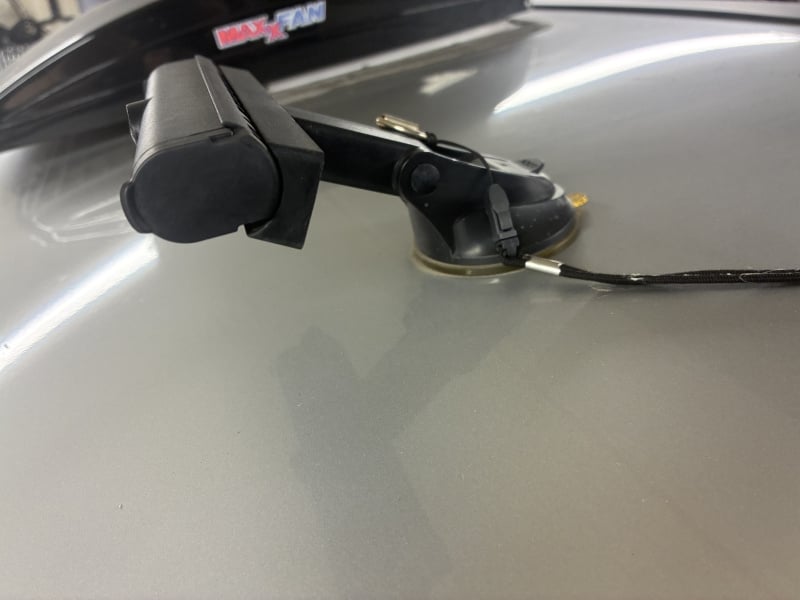 Have you considered a suction cup mount just above the running light? You could still steal power from the light. I mounted a camera high on the roof of our 320 so that, along with seeing traffic behind, I could keep an eye on the stuff on the roof rack.