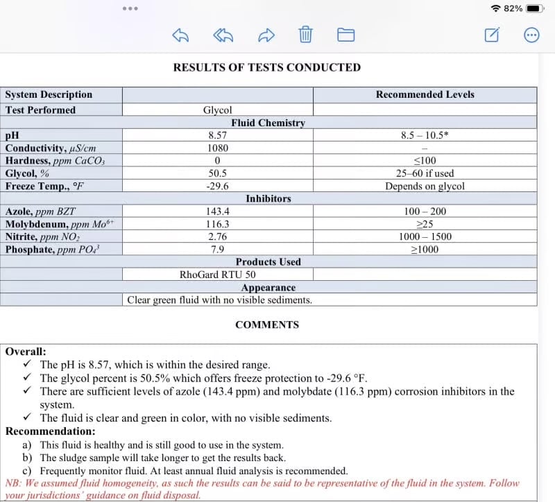 The results tell me that at present the glycol is okay, but it is aging. There is no immediate need to do an exchange. It would be advisable to plan for an exchange at the end of this season or next spring. This would then reset the known baseline, restore full corrosion protection, and remove any doubt about the system for years.